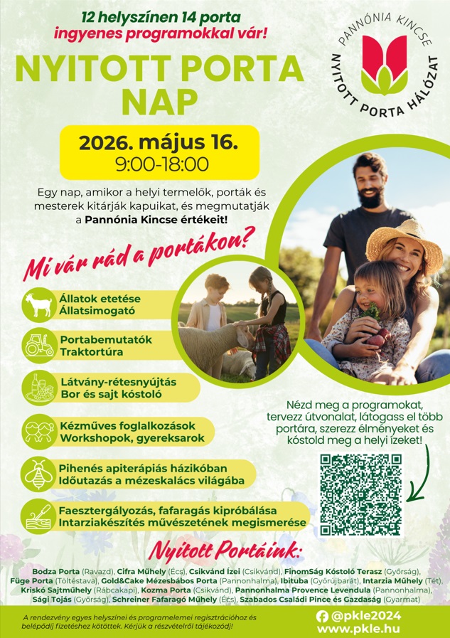 Nyitott Porta Nap 2026 – május 16. 🌿 🔗 Részletek és programok:https://www.facebook.com/events/1883050753098355 További megvalósult projektek Tájékoztatás ünnepi nyitvatartásról Módosult a Gyermek- és ifjúsági táborok szervezése című pályázati felhívás Meghívó műhelynapra Harmadik benyújtási szakaszához érkezett a „Helyi gazdaságfejlesztés támogatása” című pályázat (KAP-RD57-072-1-25)